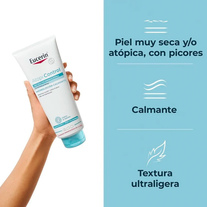 ¿Sufres de picor y sequedad en tu piel? Eucerin AtopiControl Hidroloción Calmante es la solución que necesitas.