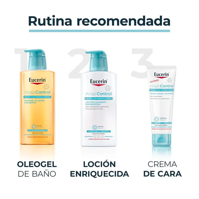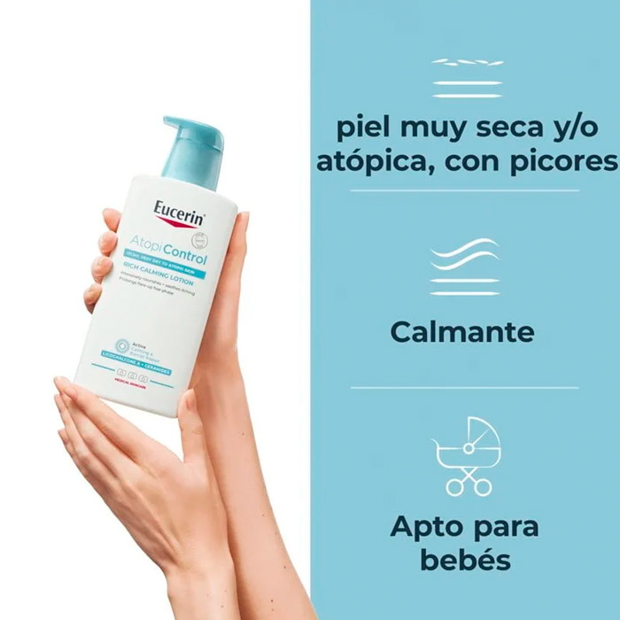 Eucerin Atopicontrol Loción Calmante Enriquecida es un cuidado básico diario, especialmente formulado sin perfume para piel seca y atópica.