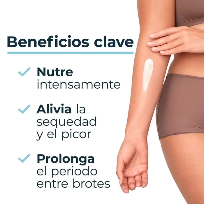 Su fórmula rica y suave proporciona un alivio duradero del picor y la sequedad, a la vez que regenera la barrera cutánea, ayudando a prolongar el período entre brotes de dermatitis atópica.