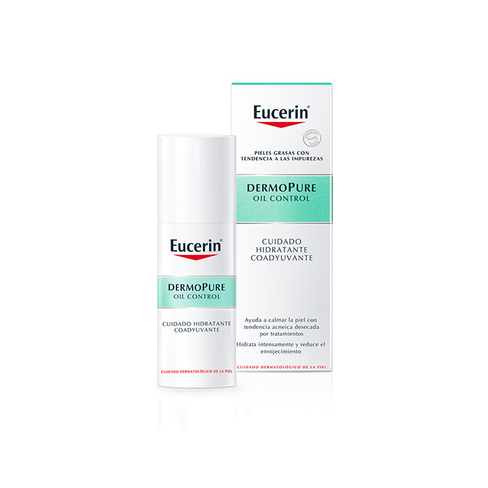 Eucerin Dermopure Oil Control Cuidado Hidratante Coadyuvante ayuda a calmar la piel con tendencia acneica desecada por tratamientos. Hidrata intensamente y reduce el enrojecimiento.