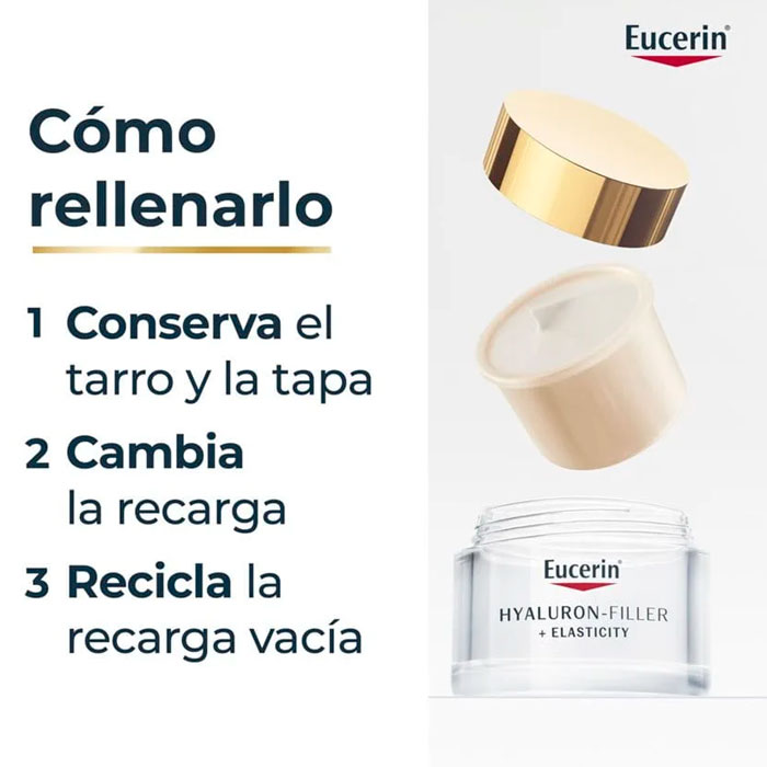 Con la Recarga Eucerin Hyaluron-Filler + Elasticity Día Fps30 aprovecha el poder antiedad. diseñada para ser usada con tu envase original.