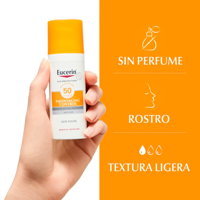 Eucerin Photoaging Control Sun Fluid SPF50+ tiene una textura ligera y fluida que se absorbe rápidamente, lo que lo hace cómodo de usar bajo el maquillaje u otros productos para el cuidado de la piel.