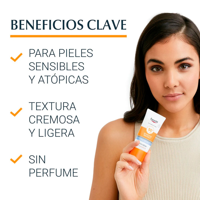 Eucerin Sensitive Protect Sun Cream SPF50+ es un protector solar facial ideal para el cuidado diario de la piel sensible y seca, que ofrece una protección efectiva contra los rayos UV y ayuda a calmar y proteger la piel frente a los daños solares.