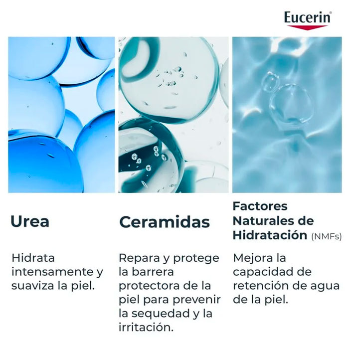 Su fórmula exclusiva actúa en tres niveles: el 10% de urea suaviza e hidrata intensamente; los NMF aumentan la capacidad de la piel para retener agua; y las ceramidas fortalecen la barrera lipídica para sellar la hidratación.