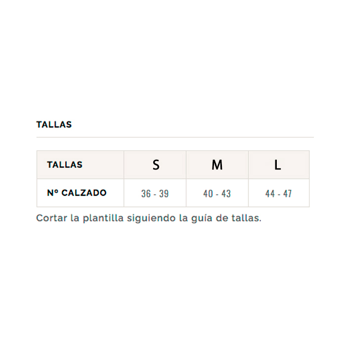 Para una adecuada colocación, quitar la plantilla que actualmente lleve el calzado. Cortar la plantilla siguendo la guía de tallas. Introducirla en el zapato con la suela textil hacia arriba.