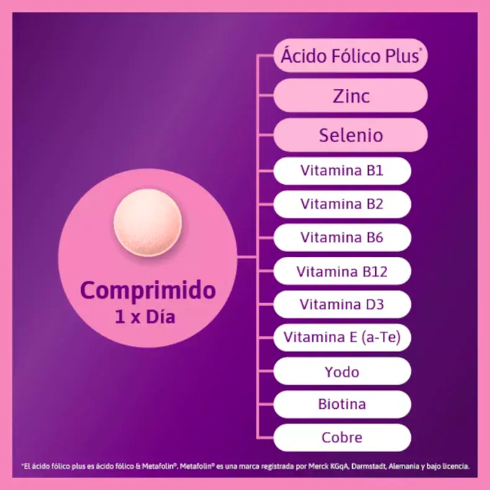 Metafolin: Forma bioactiva del ácido fólico que se absorbe más fácilmente por el organismo. Esto es importante para las mujeres que tienen dificultades para absorber el ácido fólico de los alimentos o de los suplementos tradicionales.