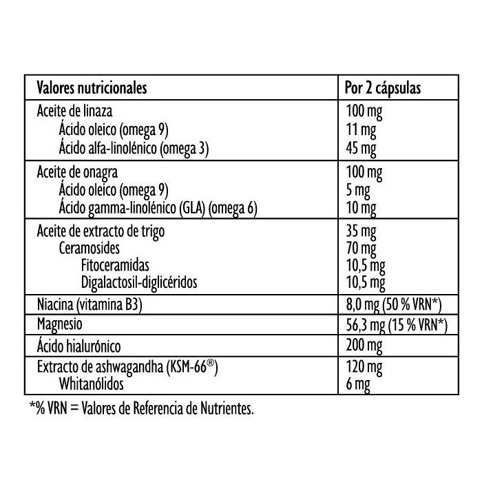 Aceite de soja refinado (Glycine max L.), gelatina, magnesio (bisglicinato de magnesio), humectante (glicerina), ácido hialurónico, aceite de semillas de linaza refinado (Linum usitatissimum), aceite de semillas de onagra (Oenothera biennis L.), extracto de raíz de ashwagandha (Withanina somnifera, KSM-66 ®), aceite de extracto de semilla de trigo (Triticum sativum), espesante (cera de abeja blanca y amarilla), emulgente (Lecitina de soja), niacina (nicotinamida) y colorante (óxidos e hidróxidos de hierro).