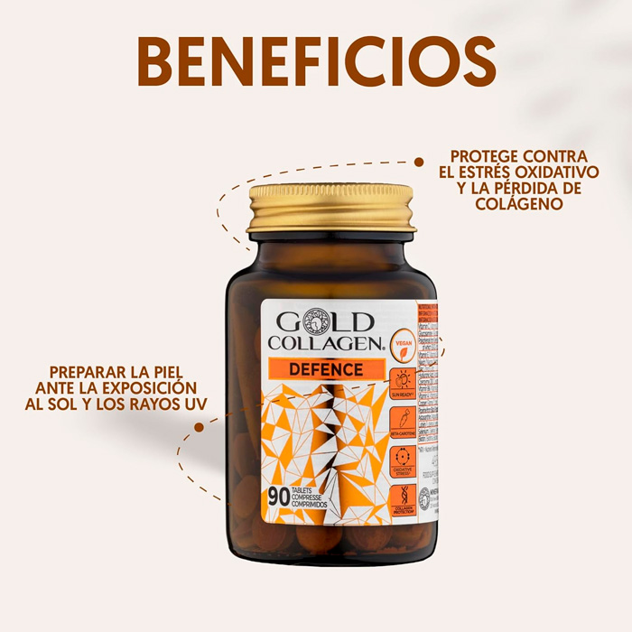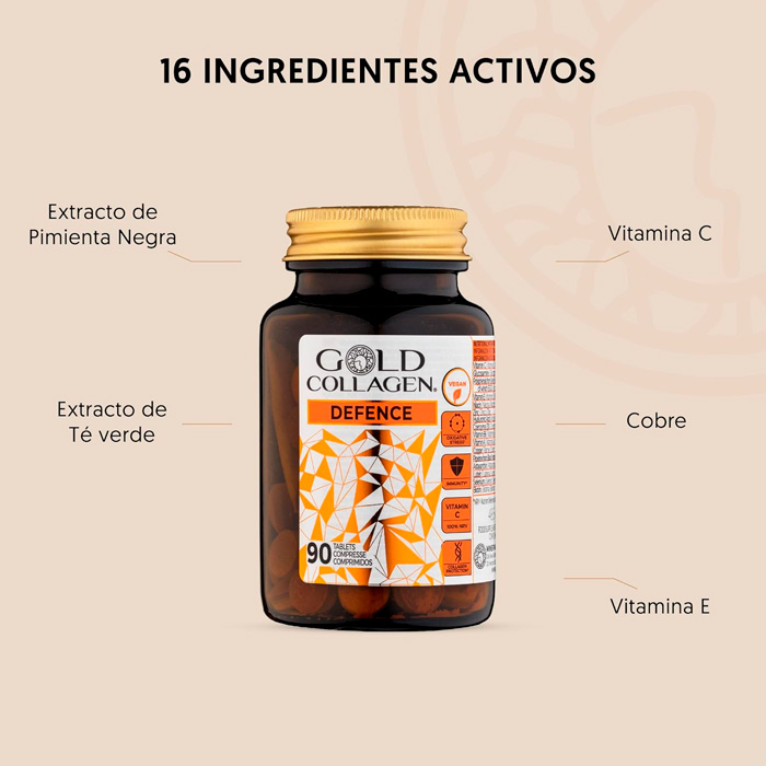 Gold Collagen Defensas es un complemento alimenticio avanzado en comprimidos diseñado para ofrecer una protección integral frente al envejecimiento y fortalecer las barreras naturales del organismo.