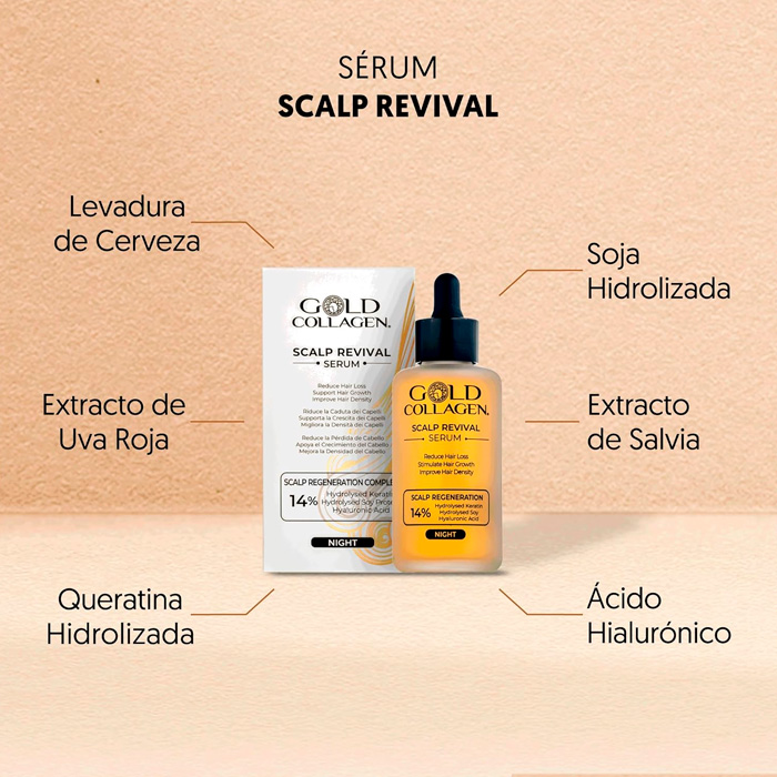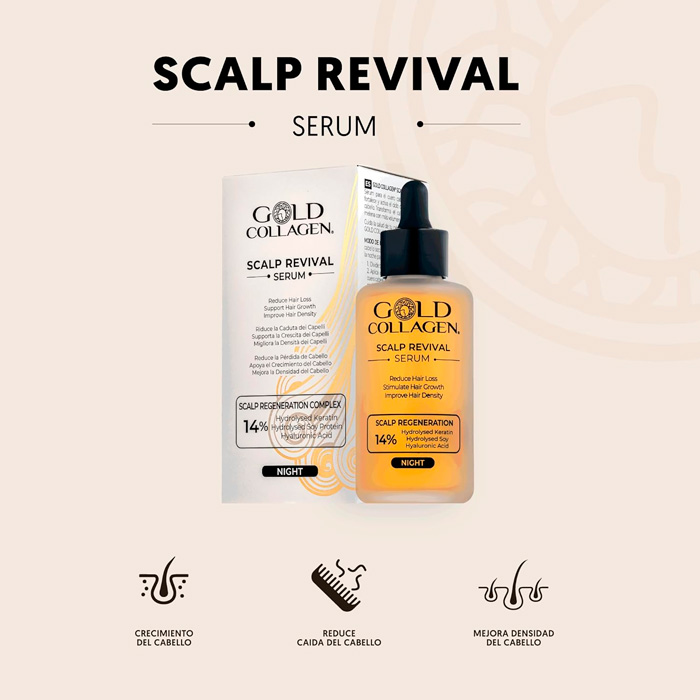 Gold Collagen Scalp Revival es un tratamiento capilar nocturno de 100 ml diseñado para transformar la salud del cabello actuando directamente desde la raíz.