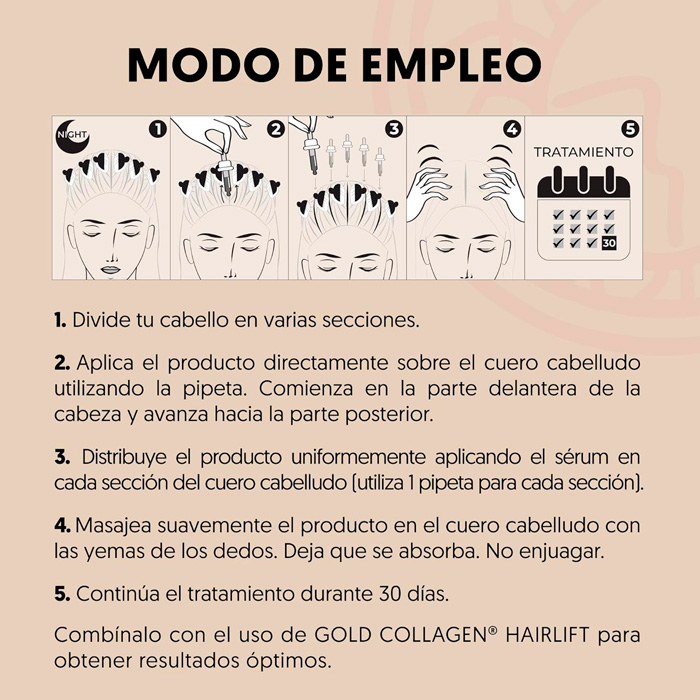 Gracias a su fórmula enriquecida con colágeno, vitaminas y extractos botánicos, el producto fortalece la estructura capilar, mejora la densidad y combate la caída, logrando una melena visiblemente más resistente, sana y radiante tras cada despertar.