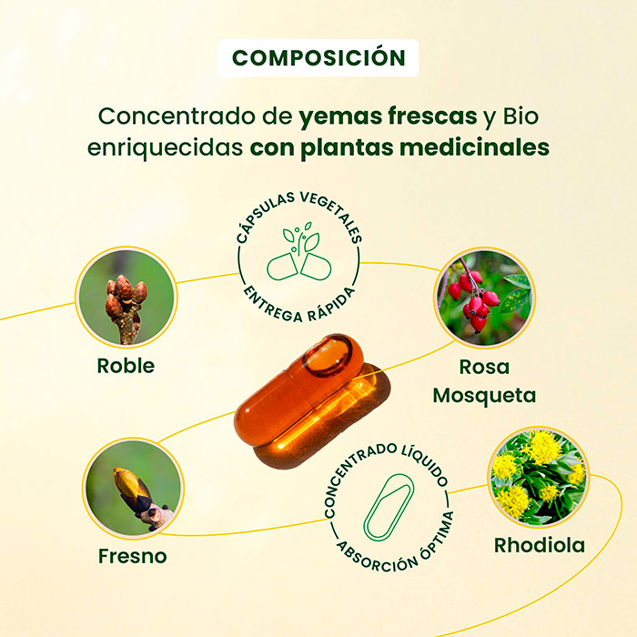 Asocia la potencia de los yemas frescos y biológicos (Roble, Escaramujo y Fresno) con los beneficios de la planta adaptógena Rhodiola para favorecer la capacidad de adaptación del organismo frente al estrés emocional.
