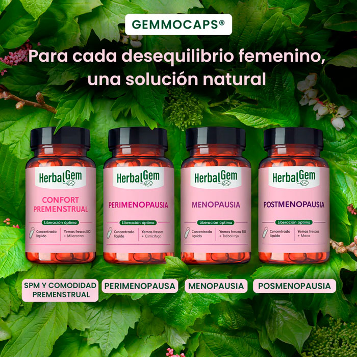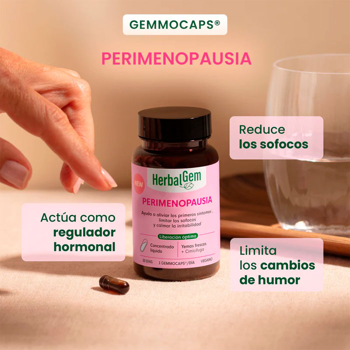 Herbalgem Perimenopausia es un complemento alimenticio diseñado para ayudar a regular y aliviar de forma natural los primeros signos y síntomas asociados a la perimenopausia, la etapa de transición hormonal que precede a la menopausia.