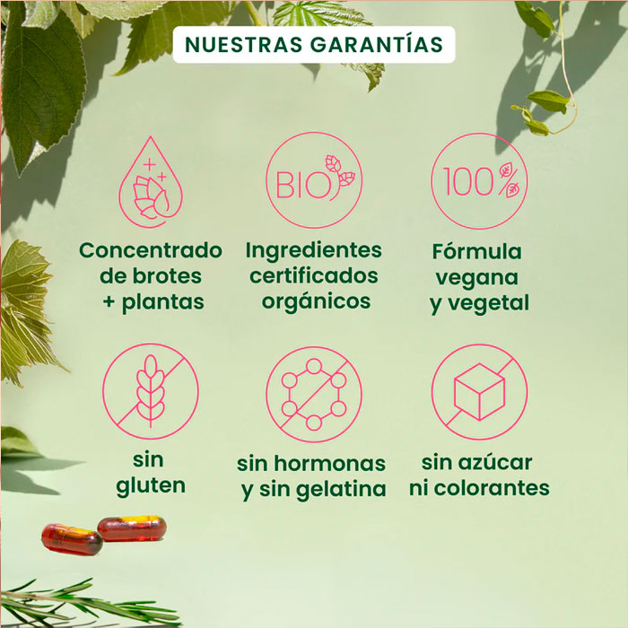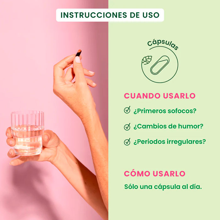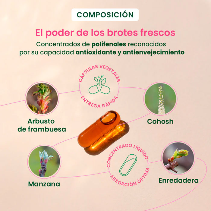 Su fórmula única combina extractos de yemas y brotes de plantas frescas, conocidos por sus propiedades equilibrantes y su capacidad para favorecer el bienestar durante esta fase de la vida de la mujer.
