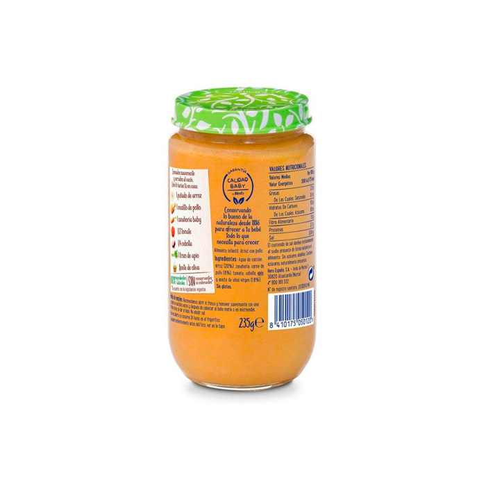Agua de cocción, arroz (20%), carne de pollo (8%), zanahoria, tomate, cebolla, apio y aceite de oliva virgen (1.6%).