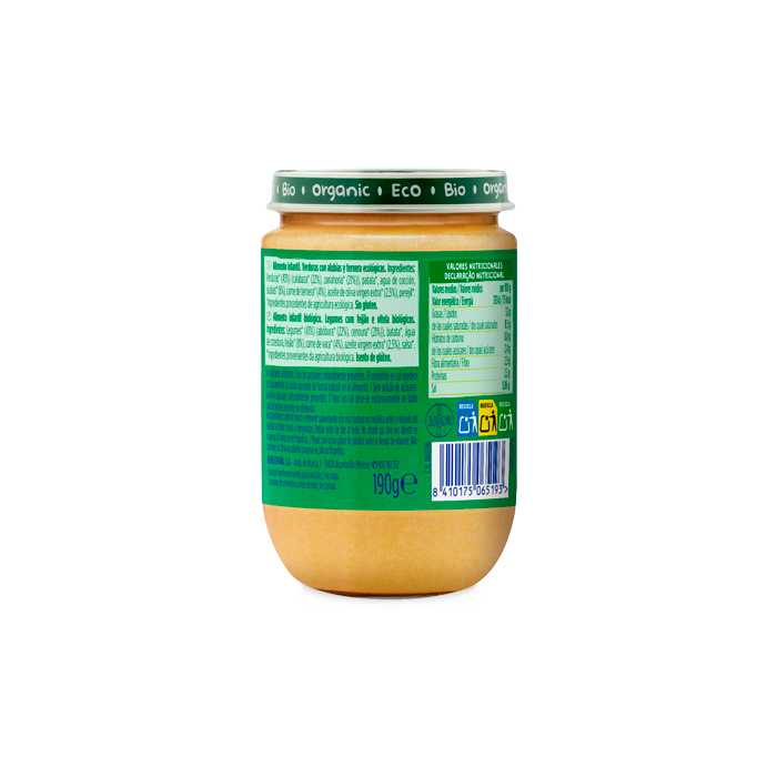 Verduras* (43%) (calabaza* (22%), zanahoria* (21%)), patata*, agua de cocción, alubias* (8%), carne de ternera* (4%), aceite de oliva virgen extra* (2,5%) y perejil*.*Ingredientes de la agricultura ecológica