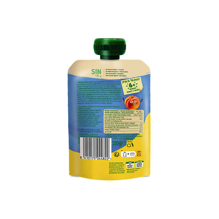 Purés y zumo de fruta a partir de concentrado en proporción variable 100% (manzana, plátano, zumo de naranja, melocotón, albaricoque), zumo de limón a partir de concentrado y vitamina C. Sin gluten.