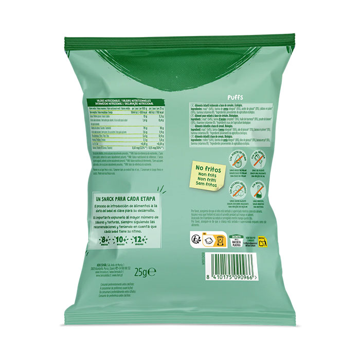 Los Hero Solo Snack Puffs Maíz Avena y Plátano son un snack infantil diseñado específicamente para las manos y el paladar de los más pequeños.