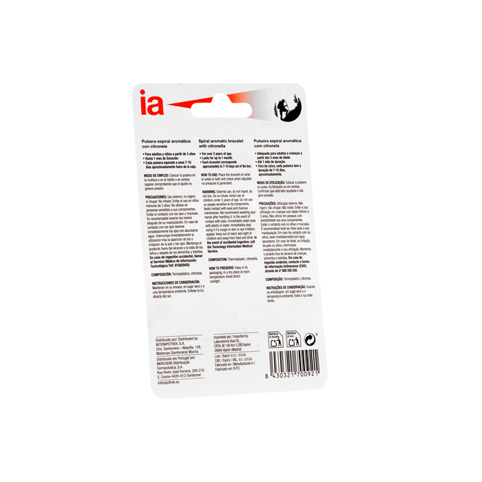 La Pulsera Espiral Citronela Interapothek es una solución práctica y natural para repeler insectos, especialmente mosquitos.