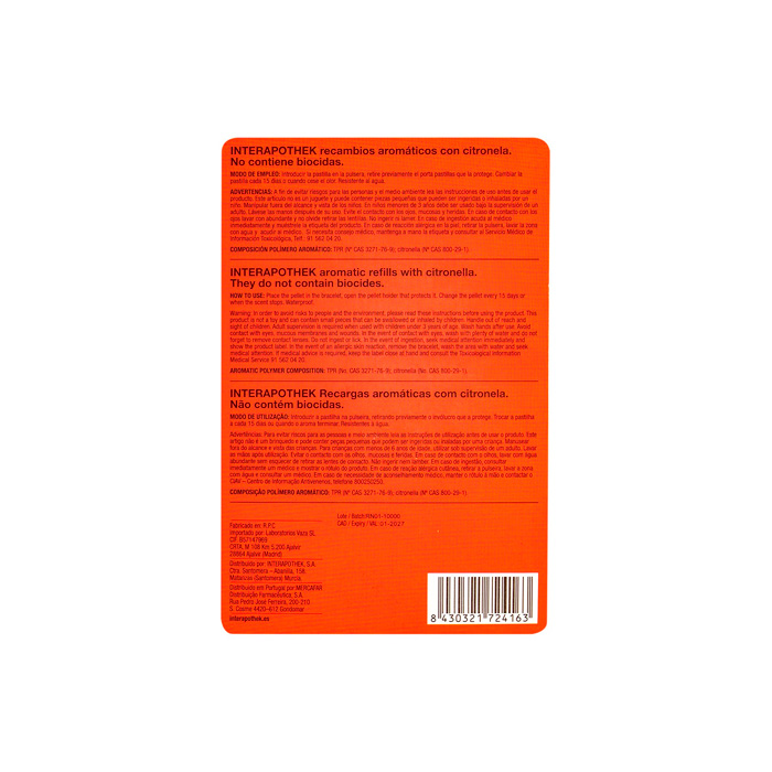 El Recambio Pulsera Neopreno Interapothek te permite mantener la protección contra mosquitos de tu pulsera de neopreno con citronela.