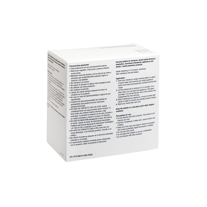 Retire su prótesis o aparato dental de la boca. Limpie el dispositivo cuidadosamente con un cepillo. Sumerja la prótesis o aparato en un vaso con aproximadamente 100ml o 200ml de agua tibia (a unos 35ºC) para que la prótesis o el aparato dental quede completamente sumergido. Deje el dispositivo en la solución al menos 10 minutos (100ml) o 15 min(200ml). Para una limpieza profunda deje su dental en el vaso toda la noche. Antes de volver a colocar su prótesis o aparato dental, éste debe enjuagarse con abundante agua. Vacíe y limpie cuidadosamente el recipiente utilizado.