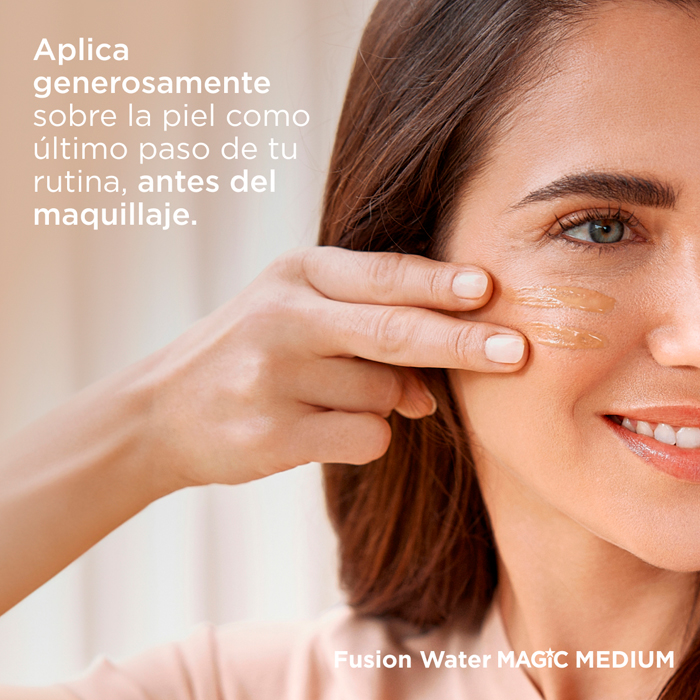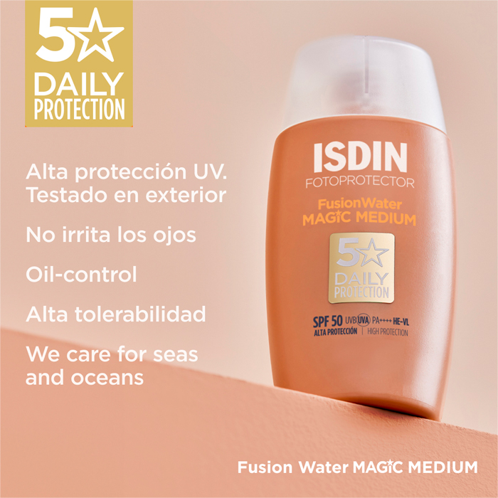 Isdin Fotoprotector Fusion Water Magic Medium Spf50 es un protector solar facial con color y acción antioxidante que ofrece una alta protección solar (SPF 50) y unifica el tono de la piel.