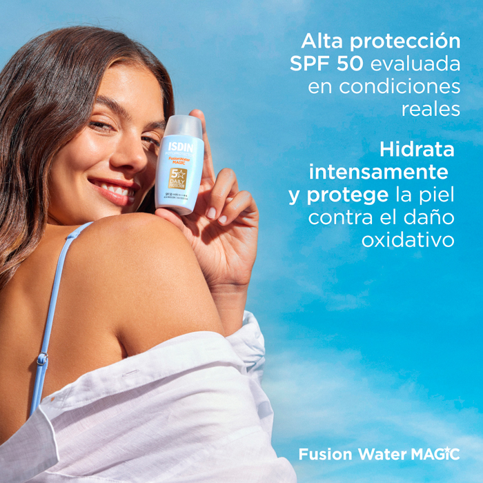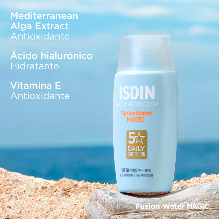 Isdin Fusion Water Magic SPF50 es un protector solar facial de textura ultraligera y fase externa acuosa con acabado final sedoso. Ofrece una alta protección contra los rayos UVA y UVB, a la vez que hidrata y aporta acción antioxidante a la piel.