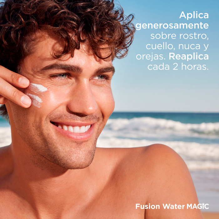 Aplica Isdin Fusion Water Magic Spf50 50ml generosamente sobre la piel seca. La cantidad adecuada para la zona del rostro son dos líneas de producto extendidas en dos dedos. Repártelo homogéneamente por todo el rostro, cuello, nuca y orejas.