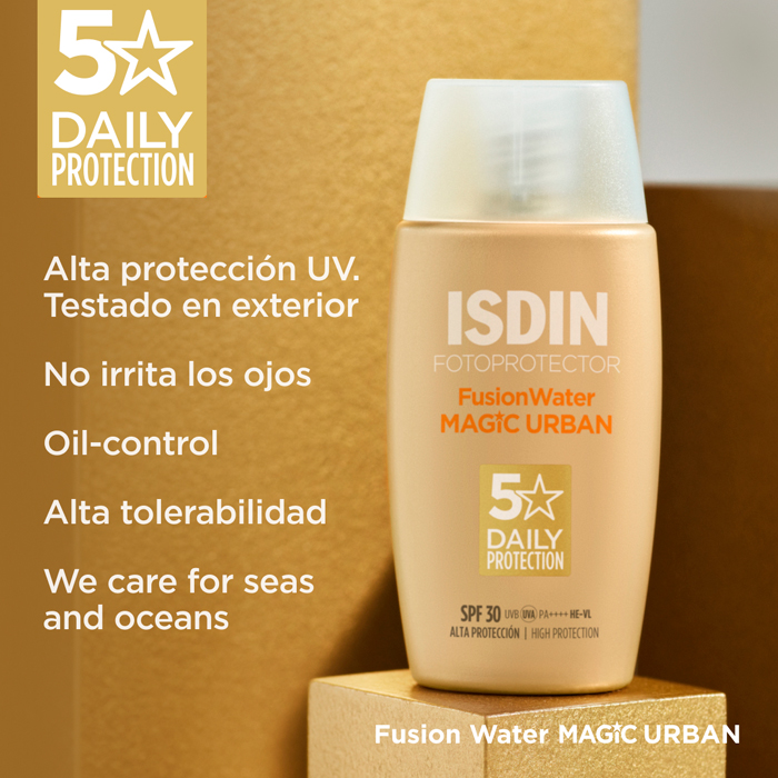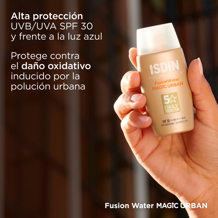 Isdin Fotoprotector Fusion Water Magic Urban SPF30 es un fotoprotector facial diseñado para ofrecer una protección completa contra los efectos nocivos de la radiación solar y la contaminación urbana.