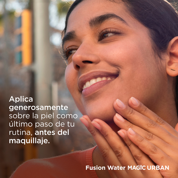 Aplicar Isdin Fotoprotector Fusion Water Magic Urban Spf30 50ml generosamente sobre la piel seca como último paso de la rutina de cuidado de la piel, antes del maquillaje. La cantidad adecuada para la zona del rostro son dos líneas de producto extendidas en dos dedos. Repártelo homogéneamente por todo el rostro, cuello, nuca y orejas.