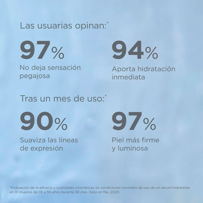 Su fórmula avanzada, basada en Ácido Hialurónico puro, penetra profundamente para proporcionar una hidratación inmediata y duradera, incrementando los niveles hídricos de la piel en un 50% desde la primera aplicación.