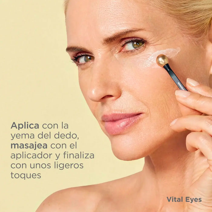 Gracias a sus ingredientes activos, Vital Eyes contribuye a detoxificar la piel, eliminando las toxinas acumuladas y atenuando la apariencia fatigada que se refleja en la mirada.