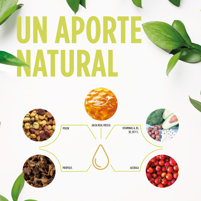 Su deliciosa fórmula, con sabor a fresa, combina los beneficios de la jalea real fresca, el própolis, el polen y un completo complejo vitamínico.