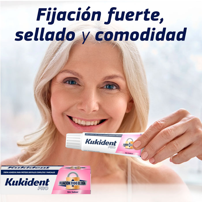 Con Kukident Pro Fijación Todo el Día, podrás hablar, reír y comer con confianza, sin preocuparte por movimientos inesperados de tu prótesis.