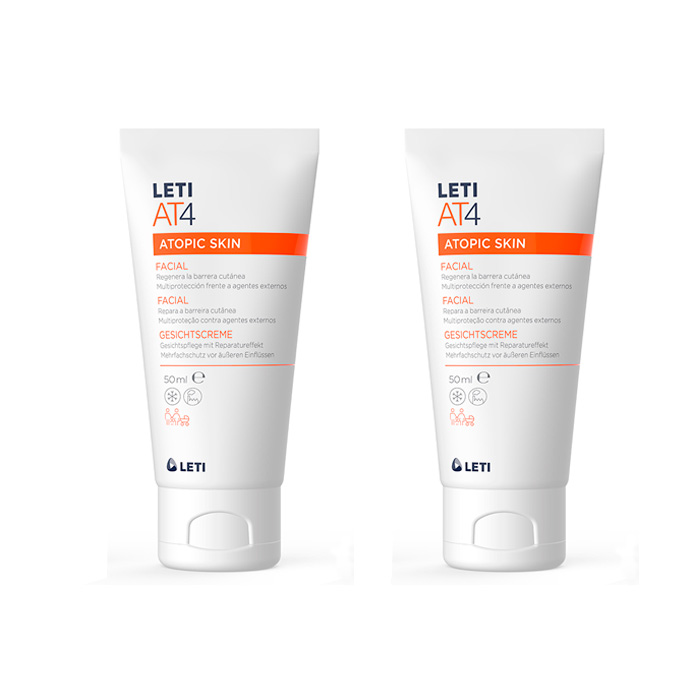 Leti AT4 Crema Facial se presenta en formato Duplo (50ml+50ml), siendo una crema especializada para el cuidado diario de la piel atópica.