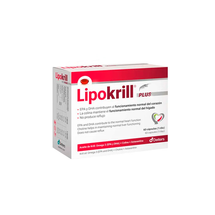 Lipokrill Plus es un complemento alimenticio formulado con ácidos grasos omega-3 (EPA y DHA) que contribuyen al funcionamiento normal del corazón, a mantener niveles normales de triglicéridos en sangre y a mantener la presión arterial normal.