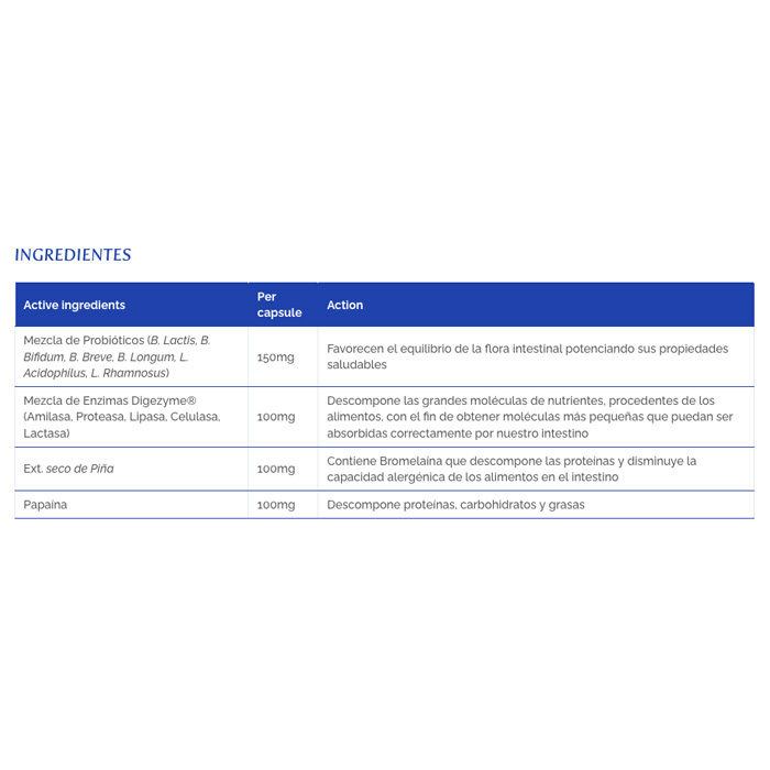 Esta fórmula exclusiva combina probióticos y una mezcla cuidadosamente seleccionada de enzimas digestivas. Formulado con: