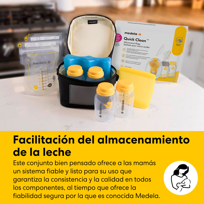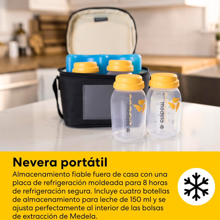 Diseño Ergonómico: La bolsa térmica y el acumulador de frío están diseñados para encajar perfectamente con las botellas Medela, maximizando el espacio.