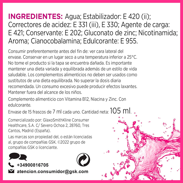 500 mcg de Vitamina B12 (20.000% IR), 1,5 mg de Zinc (15% IR), 5,4 mg de Niacina (33% IR)