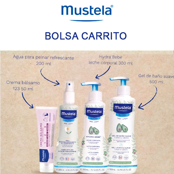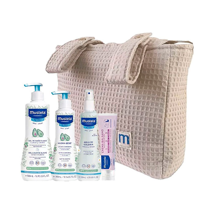 Esta bolsa práctica y cómoda no solo te permite llevar todo lo necesario de forma organizada, sino que también contiene una selección de productos Mustela, formulados con ingredientes de origen natural para la delicada piel de tu pequeño.