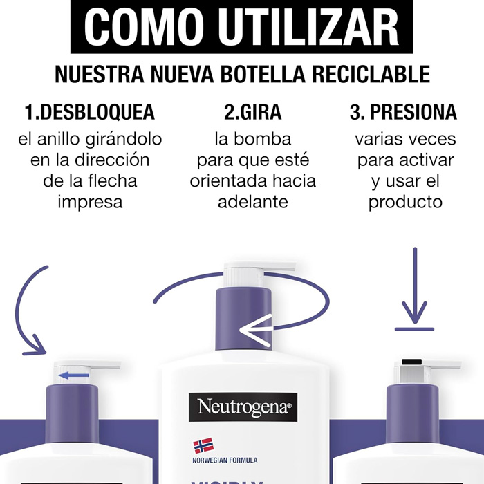 Aplicar la Loción Elasticidad Intensa de Neutrogena sobre la piel limpia y seca, masajeando suavemente hasta su completa absorción. Puede ser utilizada diariamente para mantener la piel hidratada y elástica.
