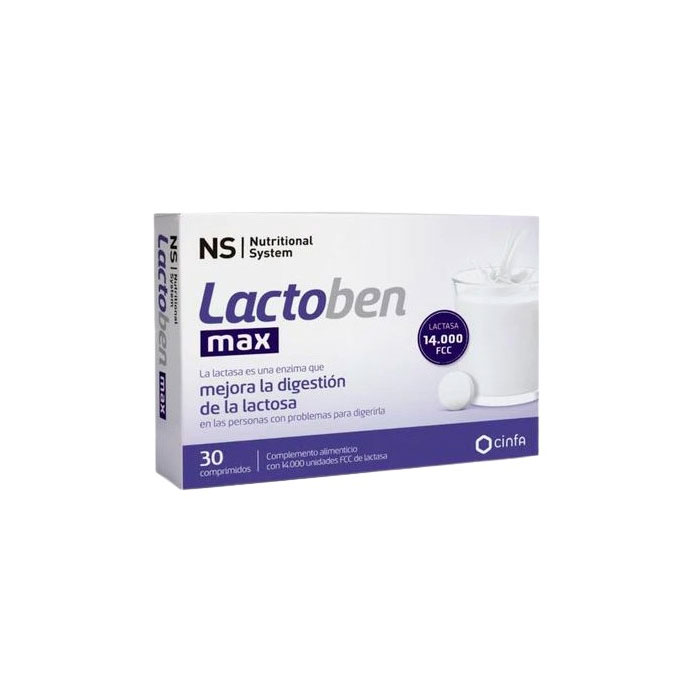 Ns Lactoben Max es un complemento alimenticio que ayuda a digerir la lactosa gracias a su contenido en lactasa (14.000 FCC). Permite a los intolerantes a la lactosa comer alimentos con lactosa sin sufrir las molestias intestinales y gases que normalmente les provoca la lactosa.