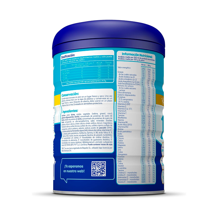 Lactosa, grasa láctea, aceites vegetales (nabina, girasol, coco), galacto-oligosacáridos (leche), concentrado de proteínas de suero de leche, aislado de proteína de leche, concentrado de proteínas de suero de leche enriquecido en alfa-lactoalbúmina, sales minerales (fosfato potásico, cloruro cálcico, citrato cálcico, citrato sódico, cloruro magnésico, hidróxido cálcico, sulfato ferroso, sulfato de cinc, sulfato cúprico, sulfato de manganeso, yoduro potásico, selenito sódico), aceite de pescado (DHA), L-tirosina, aceite de Mortierella alpina (AA), cloruro de colina, vitaminas (C, E, niacina, ácido pantoténico, riboflavina, tiamina, A, B6, ácido fólico, K, D, biotina, B12), inositol, taurina, emulgente ( lecitina de girasol), nucleótidos (5' monofosfato de citidina, 5' monofosfato de uridina disódica, 5' monofosfato de adenosina, 5' monofosfato de guanosina disódica, 5' monofosfato de inosina disódica), Bifidobacterium animalis subspecies lactis CECT8145 (BPL1®HT*), L-carnitina. Puede contener trazas de soja. *BPL1® es una marca registrada de Biopolis S.L. utilizado bajo licencia por Alter Farmacia S.A.