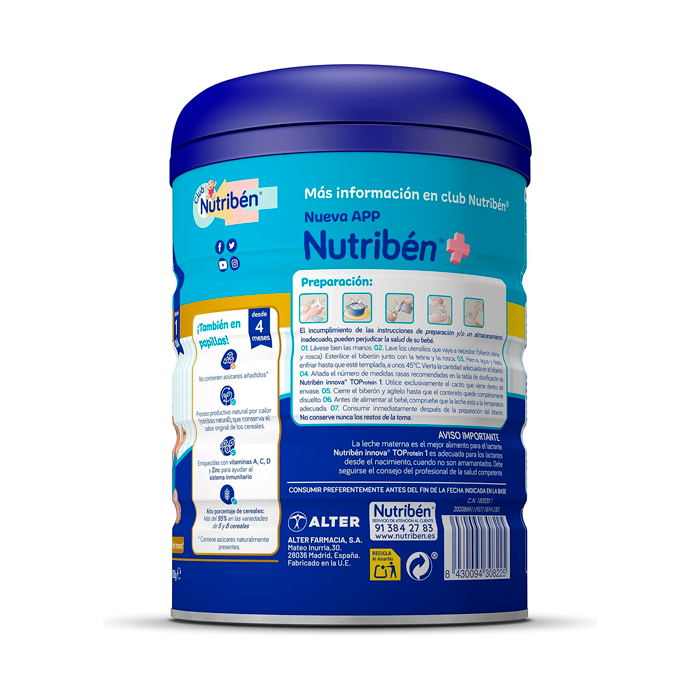 Nutribén Innova Toprotein 1 es una leche de inicio especialmente diseñada para bebés desde el nacimiento hasta los 6 meses de edad.