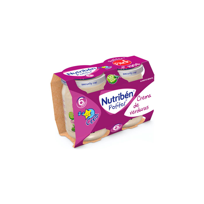 Nutribén Potitos Crema de Verduras es un potito para la cena con patatas, puerros, zanahorias y 100% AOVE, elaborado siguiendo las recomendaciones de la ESPGHAN. Está indicado para alimentar a los bebés a partir de los 6 meses.