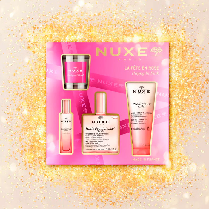 El Cofre Happy In Pink Nuxe es un set que captura el irresistible encanto de las estimulantes fragancias florales de la gama Prodigieux Floral.