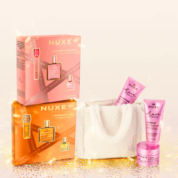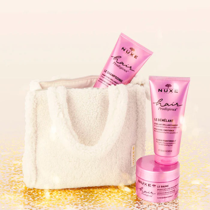 El Hair Prodigieux Tu Ritual Capilar Excepcional de Nuxe es un set completo de cuidado capilar diseñado para obtener un cabello sedoso y brillante. Toda la rutina está perfumada con la fragancia icónica de Huile Prodigieuse.