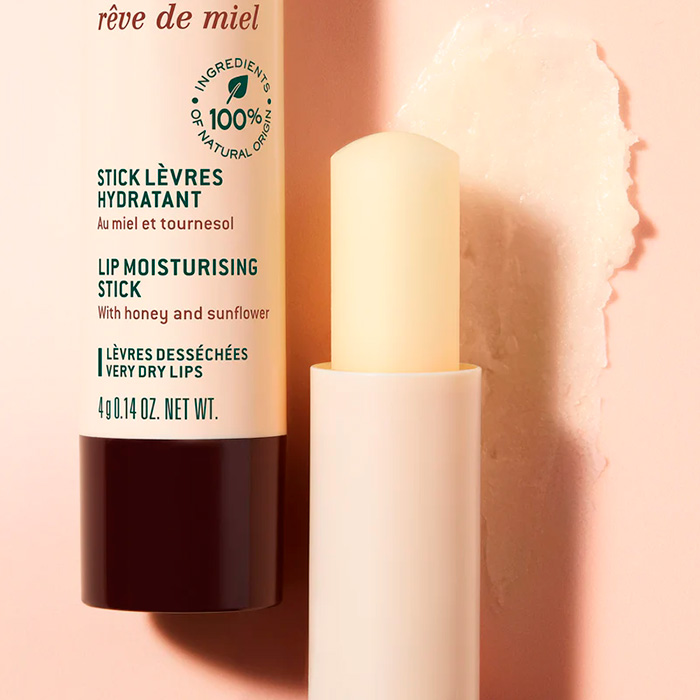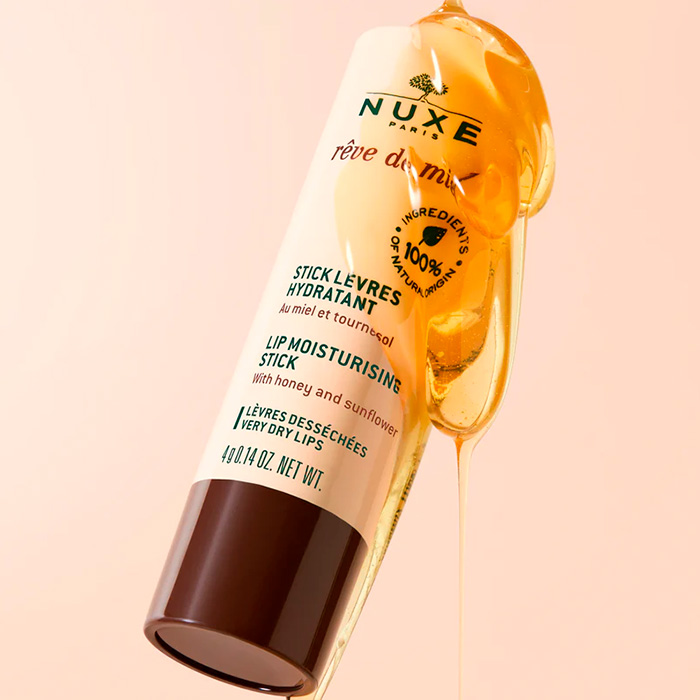 Nuxe Stick Labial Reve de Miel es un tratamiento con formato ultra-práctico diseñado para calmar y suavizar los labios secos en cualquier momento del día.