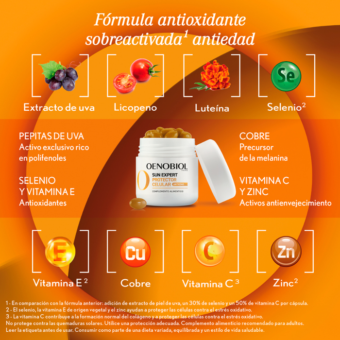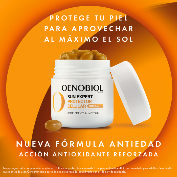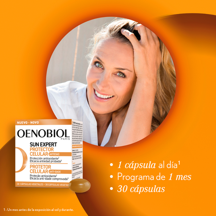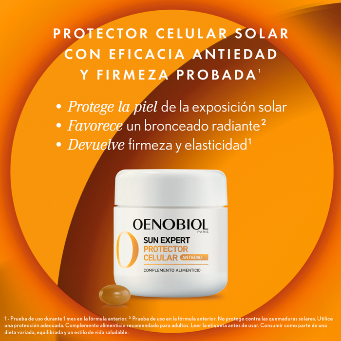 Oenobiol Sun Expert Protector Celular Solar Antiedad es un complemento alimenticio antiedad que ofrece una triple acción para proteger tu piel del sol y ayudarte a conseguir un bronceado radiante.