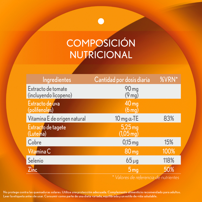 Para 1 cápsula : Vitamina C: 80 mg (100% de los VRN*) Extracto de tomate: 90 mg de los cuales Licopeno : 9 mg; Extracto de uva: 40 mg de los cuales polifenoles 6mg; Vitamina E: 10 mg; Zinc: 5 mg (50% de VRN*); Extracto de tagete: 5,25mg (luteína: 1,05 mg); Cobre: 0,15 mg (15% de VRN*); Selenio: 0,065μg (118% de VRN*)