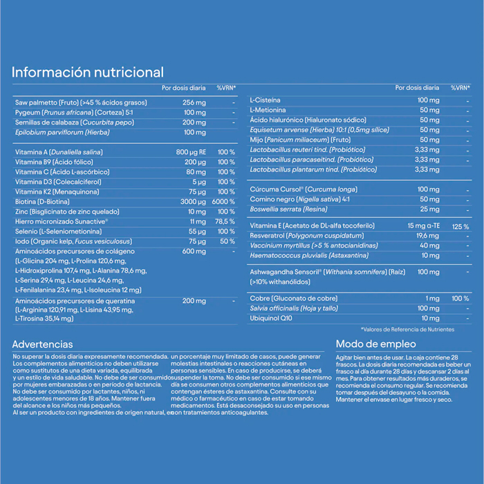 Agua; Humectante (glicerina); Fructosa de uva; Aminoácidos precursores de colágeno (L-glicina, L-prolina, L-hidroxiprolina, L-alanina, L-serina, L-leucina, L-fenilalanina, L-isoleucina); Ext. de Saw palmetto (Serenoa repens, fruto); Aminoácidos precursores de queratina (L-arginina, L-lisina y L-tirosina); Ext. de semillas de calabaza (Cucurbita pepo, semillas); Sunactive® hierro micronizado (pirofosfato férrico); Aromas; Cursol® ext. de cúrcuma (Curcuma longa, rizoma); Sensoril® ext. de ashwagandha (Withania somnifera, raíz); Ext. de Pygeum (Prunus africana, corteza); Ext. de Epilobium (Epilobium parviflorum, hierba); L-cisteína; Ext. de salvia (Salvia officinalis, hoja y tallo); Ácido L-ascórbico (vitamina C); Ext. de Fucus vesiculosus (0,1 % iodo), alga; Estabilizantes (celulosa microcristalina, sodio carboximetilcelulosa); Ext. de Dunaliella salina, alga (7,5 % b-caroteno); Ácido hialurónico (hialuronato de sodio); Ext. de cola de caballo (Equisetum arvense, hierba); Ext. de comino negro (Nigella sativa, semillas); Ext. de mijo (Panicum miliaceum, semilla); L-metionina; Estabilizante (sucroésteres de ácidos grasos); Acidulante (ácido cítrico); Ext. de arándano azul, >5 % antocianidinas (Vaccinium myrtillus, fruto); Menaquinona (vitamina K2); Bisglicinato de zinc; Acetato de DL-alfa tocoferilo (vitamina E); Ext. de Boswellia (Boswellia serrata, resina); Conservadores (sorbato de potasio, sodio benzoato); Espesante (goma xantana); Ext. de Polygonum cuspidatum (98 % resvertarol); L-seleniometionina; Ubiquinol Q10; Ext. de Haematococcus pluvialis (astaxantina); Gluconato de cobre; Lactobacillus plantarum tindalizado; Lactobacillus paracasei tindalizado; Lactobacillus reuteri tindalizado; Biotina (D-biotina); Ext. de Cladonia rangiferina (colecalciferol); Ácido fólico (ácido pteroilmonoglutámico).